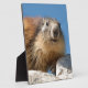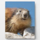 Schließung des Marmotts (Marmota marmota) auf dem Felsen am blauen Himmel, in den französischen Alpen, Savoie-Abteilung in La Plagne