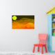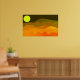 Diese zeitgenössische Digitalkunst ist eine farbenfrohe Illustration einer Retro-Abend-Berglandschaft mit einem Mond in allen Farbtönen Gold, Schwarz und Rot.
