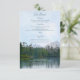 Diese landschaftliche rustikale Hochzeitskunstkarte zeigt eine Ölpastellskizze eines leicht zerklüfteten, aber ruhigen Sees, mit weit entfernten, üppigen Evergreens, Zedernbäumen und Felsstrukturen, die auf der Oberfläche reflektiert werden, und abgelegenen Bergen unter einem blauen Himmel mit klauen Wolken aus der Sicht eines Paddlerkayakings am See oder eines Wanderers am gegenüberliegenden Ufer - gemischte Schriftart ist ein aquamariner Koordinatmetscher blau - von katz_d_zynes