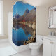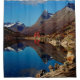 Blauer Himmel und hohe Berggipfel mit etwas Schnee. Friedlich und ruhig. Ein See, der die Landschaft perfekt reflektiert. Ein rotes Haus im Tal zwischen den Bergen. Foto aus Norwegen, Skandinavien