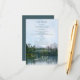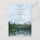 Rustikale "Unser Abenteuer beginnt" Hochzeitsdetails-Karte mit einer Ölpastellskizze eines leicht zerklüfteten, aber ruhigen Sees, mit weit entfernten, üppigen Evergreens, Zedernbäumen und Felsstrukturen, die sich auf seiner Oberfläche widerspiegeln, und abgelegenen Bergen unter einem blauen Himmel mit klauen Wolken aus der Sicht eines Paddkayakers oder Kanufahrens am See oder eines Wanderers am Ufer - Schriftart Text ist ein koordinierendes, aquamarines Blau, wie auch die Einladung zurück - von katz_d_zynes