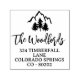 Rustikale Rücksendeadresse Gummi Briefmarke mit charmanten Schriftart und die Abbildung von Kiefern vor einem Berghang.