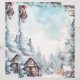 Eine schöne landschaftliche Illustration eines schneebedeckten Bergwaldes und Holzhütten. Eingerichtet von Weihnachtsbeeren, Dekoration und Kiefernfüßen. Ein wunderschöner Letterhead, um eine besondere Note an Familie oder Freunde zu Weihnachten zu schreiben.