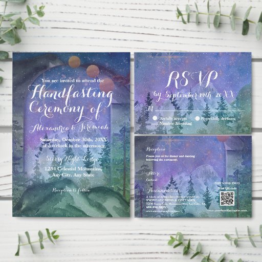 Dieses Handfasting Invite verfügt über eine einzigartige Mischung von Elementen, die den Ton für eine handfestliche Zeremonie unter dem Nachthimmel und den Sternen im Wald und in den Bergen Set.