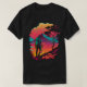 Ein cooles Retro-Design mit bunten Berglandschaften und einem Wanderer im Sonnenuntergang.
