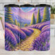 Ein kurvenreicher, gepflasterter Weg führt durch lebendige, rollende Felder lila Lavendels, flankiert von hohen grünen Bäumen. In der Ferne erheben sich majestätische, schneebedeckte Berge unter einem dramatischen Himmel voller weicher, pastellfarbener Wolken. Die Szene erinnert an eine ruhige und malerische Landschaft, ideal für einen friedlichen Ausflug.