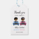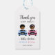 Feiern Sie Ihr Geschlecht stilvoll mit diesem lustigen Rennen Thema danke Ihnen Tag! Mit zwei bezaubernden afroamerikanischen Babys - einer fährt in einem rosa und der andere in einem blauen - fügt diese aufbereitbare Geschenkmarke Ihren Gastgeschenken eine spielerische Touch hinzu. Ideal für "Junge oder Mädchen?" Themen mit einer Drehung von Schnelligkeit und Persönlichkeit. Anpassen Sie den Text einfach an Ihr Ereignis.