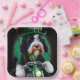 Ein wütender Freund hinter den Lenkern eines glänzenden grünen Fahrrads, das ein grünes Saint Patrick's Day Outfit trägt, das den Kopf dreht. Der Hund ist in einem festlichen Ensemble gekleidet, das mit einer grünen Bogen-Krawatte und einem passenden Oberhut versehen ist, der sich schmutzig über dem Kopf befindet. Das Outfit zeichnet sich durch die aufwändigen Entwürfe von Kleeblättern und Kobolden aus und macht deutlich, dass dieser Hund bereit ist, den St. Patrick's Day im Stil zu feiern.