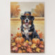Ein Aquarellbild eines fröhlichen Hundes inmitten eines Haufen lebendiger Herbstlaub, umgeben von winzigen Kürbissen und verstreuten Eichhörnchen. Der Hund trägt einen kleinen Pilgerhut und strahlt vor Freude aus, um den Geist des Erntedanks zu erfassen. Im Hintergrund sorgen weiche Erntefelder und goldfarbene Bäume für eine friedliche Landschaft. Die sanfte Struktur und die warmen, gedämpften Herbsttöne verleihen der Szene ein gemütliches, nostalgisches Gefühl, das perfekt ist, um die Schönheit der Saison zu feiern.