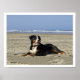 Foto eines Berner Hundes, der einen Sandstrand genießt.