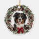 An der Vorderseite dieses Holiday-Ornament ist ein Bild eines Berner Hundes gerahmt durch einen hübschen Aquarellkiefer und einen Beerenkreat. Das Hundebild ist in der Mitte auf einem weißen Hintergrund. Ein glänzender roter Bogen verleiht dem Kranz ein bisschen Weihnachtsfunkel. Die Rückseite des Ornaments hat den gleichen Kranz mit Ihrem benutzerdefinierten Text in rot und dunkelgrün.