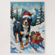 This lush, folk-art inspired woodcut illustration depicts a strong Bernese Mountain Dog, wearing a plaid Santa hat, cheerfully pulling a sled filled with Christmas firewood and gifts through a snowy alpine scene. A bold and heartwarming holiday design.