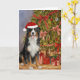 Diese Weihnachtskarte zeigt ein Aquarellbild eines Berner Hundes mit einer Weihnachtsmannmütze, die unter einem Weihnachtsbaum sitzt.