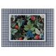 Stilvolles Glasschneidbrett (das sich als Charcuterie-Tablett verdoppeln kann) mit Aquarellbild einer Traubenmedaille auf der Weinrebe, auf dunklem Hintergrund mit hübschem Landpicknickschinken-Hintergrund