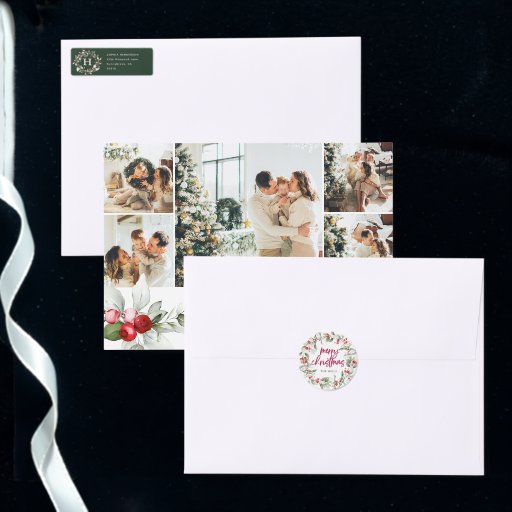 Feiern Sie die Saison mit unserer wunderbar personalisierten Weihnachtskarte, die sich perfekt für die Freude Ihrer Familie eignet. Die Vorderseite der Karte zeigt fünf Ihrer Lieblings-Fotos und schafft so ein herzliches Bild von wertvollen Momenten. Unter den Fotos umrahmt eine zarte Aquarellbeerentalistin das festliche "Frohe Weihnachten" in eleganter Kalligrafie und verleiht dem Gruß eine Touch von Urlaubsszauber. Auf der Rückseite, fügen Sie zwei weitere Fotos und eine benutzerdefinierte Nachricht, sodass es wirklich Ihre eigene. Ideal für Familien, ist diese Karte eine wunderschöne Möglichkeit, warme Wünsche zu senden und bleibende Erinnerungen zu schaffen. Personalisieren Sie Ihre noch heute!