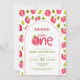 Strawberry Berry Erstgeburt Einladung für Mädchen, die süß eins werden. Wasserfarbene Erdbeeren, Blätter und Akzente mit weißem Blumen. Berry 1. Geburtstag einladen.