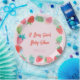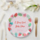 A cute baby shower party plate with hand painted strawberries in red and pink with little blue and green accents.