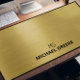 Eine minimalistische Design-Tischmatte, ein großes Mauspad für Geschäftsleute oder ein Zuhause-Office. Macht eine tolle Geschenkidee für Ihre Angestellten, Freunde oder Familienmitglieder, oder vielleicht auch für sich selbst. Die gebürstete goldfarbene Metallkonstruktion mit Monogramm und Namen wird in jeder Zuhause oder in jedem Büro phantastisch aussehen.