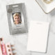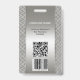 Foto ID Abzeichen im Metallbaustil mit Platz für Ihr individuelles Foto und Logo. Auf der Rückseite können Sie einen benutzerdefinierten Bar- oder QR-Code und zusätzliche Texte hinzufügen oder die Vorlagen löschen.