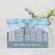 Unsere Büros sind in ein neues Gebäude umgezogen, bitte aktualisieren Sie Ihr Adressbuch. Passen Sie die Rückseite dieser beruflichen, sich bewegenden Ankündigungskarte mit Ihren individuellen Firmeninformationen für alle Ihre Geschäftskontakte und Kunden an. Eine moderne Skyline aus dem Gebäude, die für die Ankündigungen von Adressänderungen zeichne.