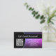 Schwarze Ober- und lila Glitzer-Set an der Vorderseite dieses Visitenkartendesigns mit einem QR-Code-Platzhalter und Geschäftsdetails. Ersetzen Sie den QR-Code des Platzhalters auf der Vorderseite durch Ihren. Füllen Sie die Vorlagenfelder aus, oder klicken Sie auf Anpassen, um den gewünschten Stil, die gewünschte Größe und Schriftart auszuwählen. Der leere Rücken erlaubt Raum für persönliche handgeschriebene Notizen. Sie können dieses Design, wo es passend ist, auch zu anderen Produkten hinzufügen, die in der TRANSFER-Scroll-Bar enthalten sind, wie z.B. dem Gepäckanhänger, um Ihr Unternehmen zu fördern.