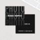 Berufliche Fotograf Square Visitenkarte mit ihren Details in weißem, fett gedrucktem Schriftart mit dem großen Wort "Foto" in dunkelgrauem, fett formatiertem Schriftart als Hintergrund auf schwarzem Hintergrund.