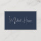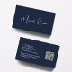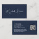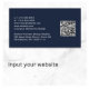 Berufliche, moderne, dunkelblaue Visitenkarte mit Ihrem Namen in einem stilvollen, weißen Signaturskript auf der Vorderseite und Ihren Kontaktinformationen (wie E-Mail, Telefonnummern, Firmenname, Social Media ID's und Mailing-Adresse) in sauberer, schlichter weißer Typografie auf der Rückseite. Auf der Rückseite, personalisieren Sie mit Ihren Kontaktinformationen und fügen Sie eine URL-Adresse ein, um einen scannbaren QR-Code zu erstellen, der mit Ihrer Website, Ihrem Portfolio, Ihrem Social Media-Profil oder einer anderen Plattform verbunden ist, die Ihre Arbeit präsentiert. Dies macht es für Kunden und Kunden leicht, Ihre Erfahrung zu erforschen.