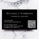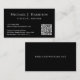 Berufliche schwarze QR-Code Visitenkarte mit Ihrem Namen in einem eleganten, weißen Serif-Schriftart und Ihrem Titel und Kontaktinformationen in einfacher weißer Typografie. Geben Sie eine URL-Adresse ein, um einen scannbaren digitalen QR-Code zu erstellen, der mit Ihrer Website, Ihrem Social Media-Profil oder einer anderen Plattform verknüpft ist, die Ihre Arbeit präsentiert. Kunden und Kunden können so Ihr Know-how einschätzen. Passen Sie zusätzlichen Text auf der Rückseite an oder verließ Sie Leerzeichen.