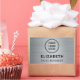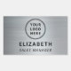 Beruflicher Namensschild mit Ihrem Firmenlogo oder Firmenlogo auf einem silberfarbenen Imitat mit metallischem Hintergrund. Fügen Sie einen Namen und Titel/Position in einfacher Typografie hinzu.