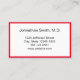 Dieser berufliche Arztbesuchskarte ist zweiseitig. Beide Seiten haben eine leuchtend rote Grenze. Auf der einen Seite steht "Ihr nächster Termin" und hat Zeilen für Datum und Uhrzeit des Termins. Am unteren Rand können Sie Text anzeigen, um eine benutzerdefinierte Nachricht zu erstellen, falls gewünscht. (Angezeigt: Bitte geben Sie 24 Stunden im Voraus an, wenn Sie Ihren Termin nicht behalten haben.) Auf Seite zwei wird Text angezeigt, der durch den Namen des Arztes (oder den Praxisnamen) und seine Adresse, Telefonnummer und Website ersetzt werden soll. Alle Texte können bearbeitet oder gelöscht werden. Der Text ist schwarz.