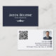 Beruflicher QR Code, Aviation themed, Blue und White, minimalistische Business Card, die potenziellen Arbeitgebern oder Kontakten sofortigen Zugang zu Ihrem Portfolio, Resume, LinkedIn Profil, Ihrem Online-Geschäft bietet. Es ist eine bequeme Möglichkeit, Ihre Fähigkeiten und Leistungen zu präsentieren, ohne dass dazu sperriges Druckmaterial benötigt wird. Die Vorderseite ist mit einem stilvollen marineblau-blauen Hintergrund mit einem weißen Bild eines Flugzeugs und einem weißen, anpassbaren Text ausgestattet. Sie können Ihren Namen, Beruf oder Titel hinzufügen. Das hintere Design weist einen weißen Hintergrund mit anpassbaren Kontaktinformationen in dunkelblauem Schriftart (Telefonnummer, E-Mail, Website, Postanschrift) auf. Sie haben auch die Möglichkeit, einen benutzerdefinierten URL hinzuzufügen, um einen scannbaren QR-Code zu erstellen. Stellen Sie sicher, dass Sie das QR-Codebild mit Ihrer Kamera testen, bevor Sie Ihre Bestellung aufgeben. Klicken Sie auf "Diese Vorlage personalisieren" oder "Dieses Design bearbeiten", um das Standard-Design der Visitenkarte mit Ihren benutzerdefinierten Details und dem QR-Codebild weiter anzupassen. Bitte kontaktieren Sie uns für weitere Anpassungen, bevor Sie Ihre Bestellung aufgeben. Vielen Dank, dass Sie unser Geschäft besucht haben. Berufliches Mitarbeiter Foto QR Code Blue Aviation Business Card ist Copyright von Soar In Style Designs LLC.