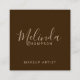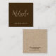 Berufliche moderne Script Kraft Paper Square Business Card mit Namen in moderner Kalligrafie Schriftart Stil und Beruf in modernen sans serif Schriftart Stil auf braunem Hintergrund auf der Vorderseite mit Kontaktinformationen auf der Rückseite. Perfekt für Makeup Künstler, Friseur, Designer, Blogger und viele andere Berufe.