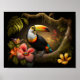 Toucan illustriert in den Zweigen von Bäumen umgeben von lebhaften tropischen Blume in einem tropischen Regenwald.
