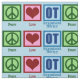 Ein niedliches beruflicher Therapeut Weihnachtsgeschenk, das ein grünes Friedenszeichen, ein rotes Herz und ein OT geschrieben in Blau auf einen blauen Hintergrund kennzeichnet. Beschäftigungstherapie ist solch ein wichtiger Beruf. Sie hilft Erwachsenen und Kindern mit sensorischer Therapie.