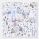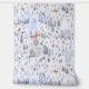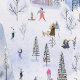 Ein niedliches und schön detailliertes, wasserfarbenes Bergskidorf mit schneebedeckten Bergen, Chalets und Ladenbesitzern, Skifahrern, Gebäude-Schneemännern, Dorfbewohnern Ansammlung, Kinder spielen, Hunde bellen und Weihnachtsbrunnen in diesem illustrierten Winterurlaubsmuster.