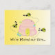 Ein niedliches Design mit einem rosa Bienenstock mit drei kleinen buschenden Bienen und Blume. "Wir haben unseren Bienenstock verschoben" passen sich mit neuer Adresse auf der Rückseite an...