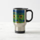 Eine helle, attraktive, mit einem Muster der goldenen gelben Sonnenblumen auf einem tiefen blauen Hintergrund, von einem Siebdruck durch Judy Adamson besonders anzufertigen Reise-Tasse.