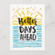 Ermutigen Sie jemanden in rauen Zeiten mit diesem fröhlichen handgeschriebenen Stil Typografie-Design mit der Botschaft in schwarz, Pinsel-Drehbuchstaben, "Better Days Ahead" umgeben von Aquarellsonne mit Rochen und Sternen und hellblauen Ozeanwellen.
