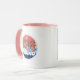 bessere Tage vor der Tasse. Weiße Tasse, rosa Handle, positive Botschaft, farbiges Design, Motivierend Zitat. Eine weiße Tasse mit rosafarbenem Griff und Interieur, mit einem lebendigen Design mit dem Text "BESTER DAYS AHEAD" in stilvoller Schrift. Im Hintergrund sind Blau-, Rosa- und Orangentöne sowie eine Illustration einer Sonne zu sehen, die eine Botschaft des Optimismus und der Hoffnung vermittelt.