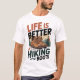 Dieses weiße Kleidungsstück enthält den abenteuerlichen Text "LIFE IST BESTER in Wanderstiefeln" in fett- und kursiven Schriftart. Ein Beispiel für kräftige braune Wanderstiefel ist das Set vor einem landschaftlichen Hintergrund von Bergen und Kiefern, was auf eine Liebe für die Erkundung der Natur und der Natur hindeutet. Ideal für Wanderer und Abenteurer.