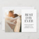 This modern wedding announcement features the words "best day ever" on the right with space for a photo on the left along with space for another photo on the back. Use it as a wedding or elopement announcement.