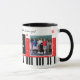 Großes Klavier hält Weihnachts-Tasse für einen Klavierlehrer. Schwarz-Weiß-Klaviertasten und Schneeflocken auf roten Streifen, mit eleganter Schrifttyp-Typografie "Herzlich willkommen im Urlaub! Wir Liebe Sie!" und "Bester Klavierlehrer aller Zeiten". und 2 Fotos Ihrer Wahl. Elegante personalisierte Winterurlaubsgeschenkidee für ihn oder sie.