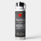 Custom teacher appreciation personalized water bottle featuring a red apple and an inspirational white typography script quote, "Teachers change the world one child at a time," on a chalkboard background. Personalize with your teacher's name and text! ++++++++++ Can be a thoughtful keepsake back to school, birthday, or Christmas gift for a teacher.