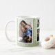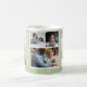 Moderne moderne 5-Foto-Collage individuelle Familienvorlage Kaffee-Tasse in pastellgrün und weiß mit einem trendigen typografischen Stil. +++++++++ Persönlich mit 5 Familienaufnahmen und Ihrem Namen und Text! +++++++++++++++++ Es kann ein schönes Geschenk für das Gedächtnis bleiben, Weihnachten, Jubiläum, neue Zuhause, Mama, Papa, Großmutter oder Großvaters Geburtstag oder andere festliche Familienfeiern.