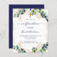 Auf der Vorderseite: Weißer Hintergrund mit Eukalyptusgrün und goldenen Blätter und Imitaten goldenen Glitzer Glitzern. Ein goldenes Kreuz. Personalisieren und den Namen und die Zeremonie Details des Kindes. Blauer Text. Zurück: marineblau Hintergrund.