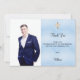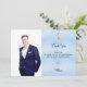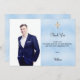 Eine moderne und elegante Bestätigung danke Ihnen Karte für ihn. Ein hellblaues Imitat mit metallischem Hintergrund, das mit einem goldenen Kreuz geschmückt ist. Personalisieren und fügen Sie Ihr Foto, danke Ihnen Notiz und Name.