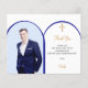 Fügen Sie ein Foto in vertikaler Größe hinzu. Ein marineblau bogenförmiger Rahmen aus Foto. Eine weiße Hintergrundfarbe. Personalisieren und fügen Sie einen Namen und Details. 1 Blatt = 1 Dankeschön, dass die Karte an der Kante gedruckt wurde.