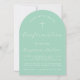 Eine einfache, moderne, bogenförmige, geschlechtsneutrale Einladung zur Bestätigung. Es hat nur weißen Text auf einem grünen Hintergrund. Im oberen Teil befindet sich ein Kreuz mit gewölbtem Text darüber. Der Anlass und der Name sind in Skripten geschrieben.