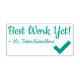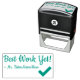 Dieses motivierende Design aus Gummi-Briefmarke beinhaltet die motivierend Feedback-Nachricht "Best Work yet!" und den Namen eines Lehrers oder Lehrers. Es verfügt auch über ein dekoratives Markierungssymbol. Es könnte von einem Lehrer, Pädagogen oder Tutor genutzt werden, um anzuerkennen, dass ein Schüler eine außergewöhnliche Arbeit geleistet hat.