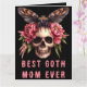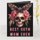 Beste Gothic Mama je Skull Moth Pink Mother's Day Card - Diese personalisiert gotische Muttertagskarte mit einem Schädel mit launischen, rosa Blumen auf einem schwarzen Hintergrund. "Best Goth Mama Ever" ist in einem bedrückten, gotischen Schriftart geschrieben. Im Inneren personalisieren Sie Ihre eigenen Fotos und Botschaften. Ideal für alternative Mütter, Mütter, die alles spukhaft mögen, Halloween und Horror, und Gothmütter, die die dunkleren Dinge im Leben mögen.